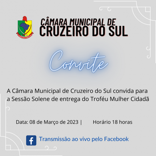 O Poder Legislativo cruzeirense convida a população para prestigiar a entrega do 1º Troféu Mulher Cidadã do Município de Cruzeiro do Sul, que ocorrerá na próxima quarta-feira, 08 de março, no Dia Internacional das Mulheres.