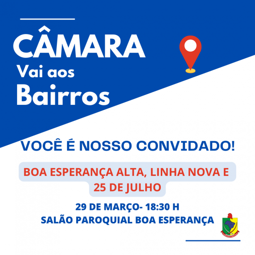 Boa Esperança Alta, Linha Nova e 25 de Julho serão as primeiras comunidades contempladas. O encontro entre vereadores e comunidade acontecerá na próxima quarta-feira (29/03), 18:30 h às 20:30 h, no Salão Paroquial Boa Esperança.