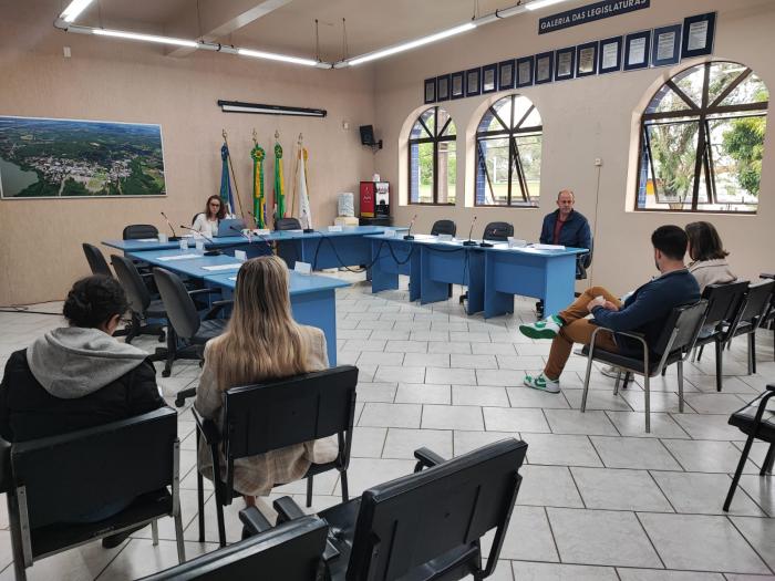 A reunião aconteceu na sede do Poder Legislativo e, além da secretária responsável, fizeram-se presentes o servidor Givago Filter, a presidente Daiani Maria (MDB), o vereador Isidoro Weschenfelder (Progressistas), a diretora geral da Câmara de Vereadores, Natália Wendt, e a assessora jurídica da Casa, Tamires Bottega.